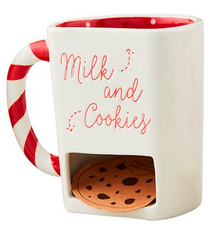 Hand-painted ceramic mug features cut-out pocket at base to hold cookie. Dishwasher & microwave safe.