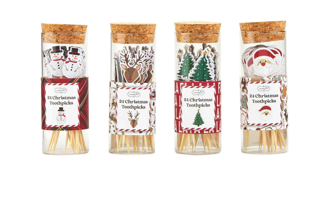 6 each of 4 styles. Set of 24 character topped toothpicks come in corked glass jar.