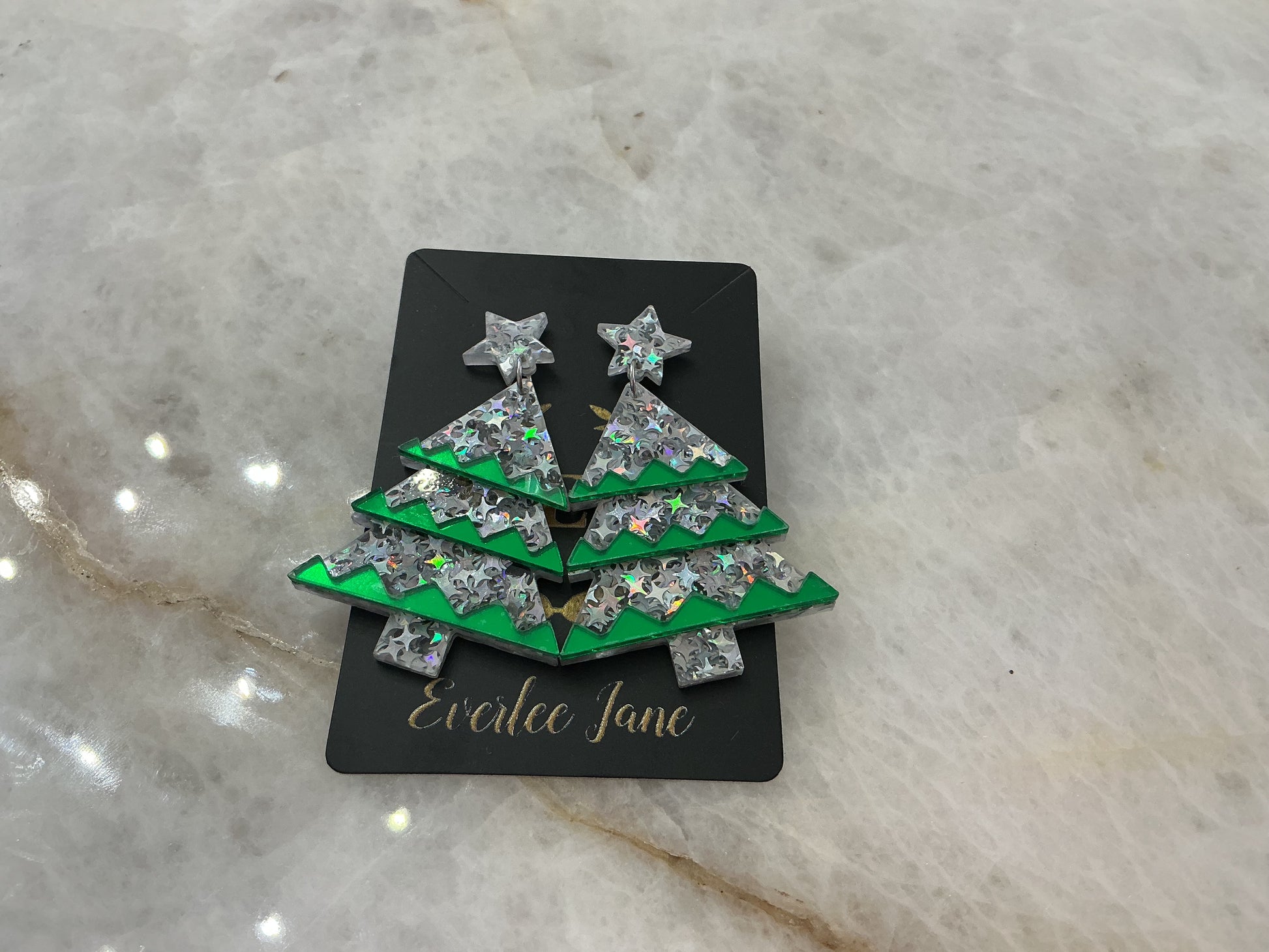 "Add some festive sparkle to your holiday look with our Christmas Tree Earrings. Made with green and silver sparkles, these earrings are the perfect accessory for your Christmas gatherings. With their elegant design, they will add a touch of holiday cheer to any outfit. Get yours today!"