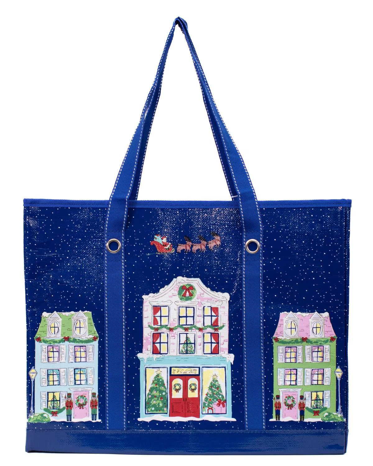 Step into the season with the Christmas Village Market Tote, featuring a festive snowy village print that captures the magic of a holiday stroll. Roomy, reusable, and ready for gift runs, market days, or spreading cheer wherever you go.