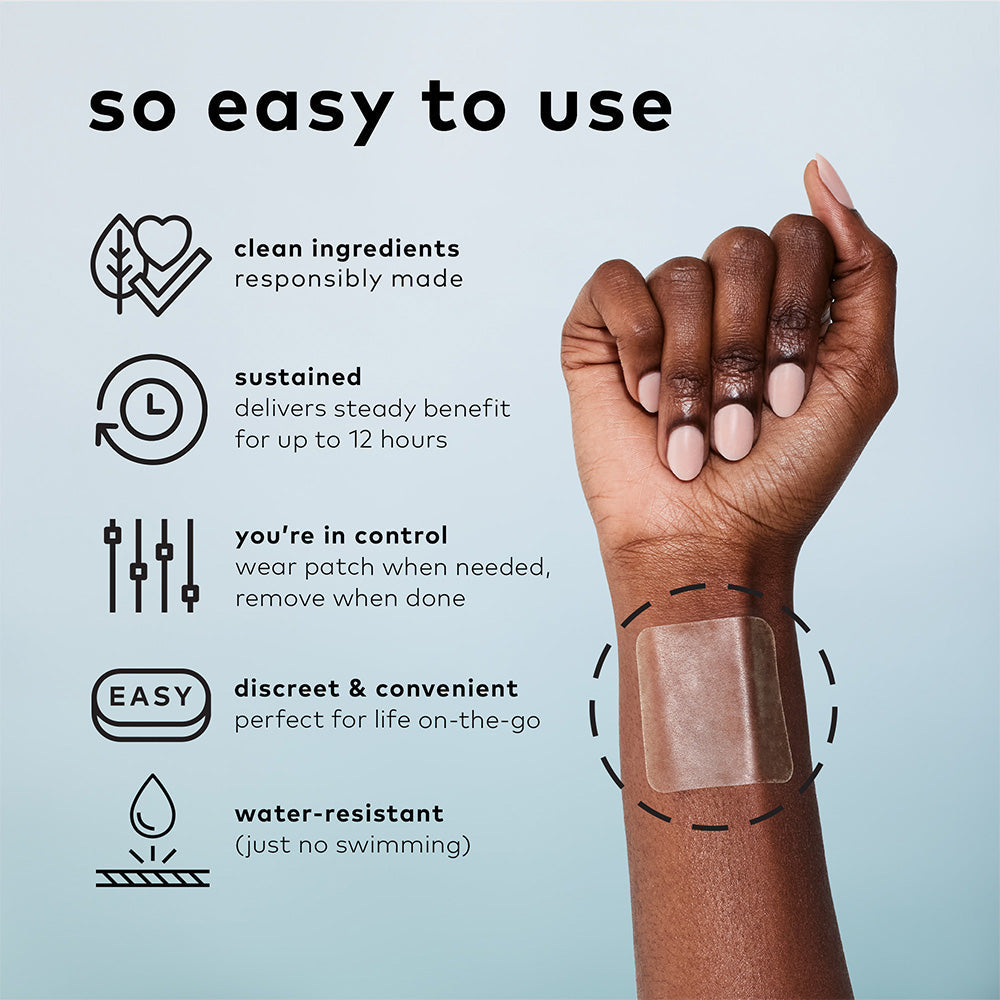 A plant-powered wearable wellness patch for sleepytime. Infused with Melatonin, Hops, and Valerian Root. Perfect for beauty rest, travel, or even just a good nap.