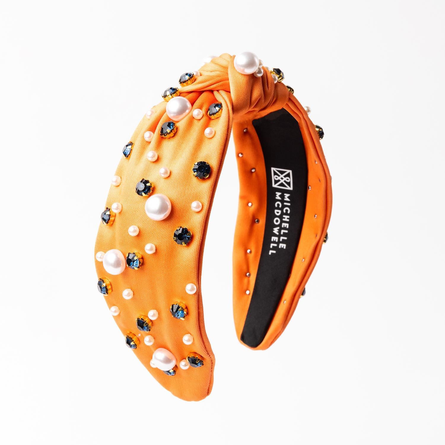 Elevate your look with the Charleigh Headband in Navy & Orange. Made with a 2 inch wide polyester band and topped with a stylish knot, this headband adds a touch of sophistication to any outfit. Perfect for keeping your hair in place while making a statement.