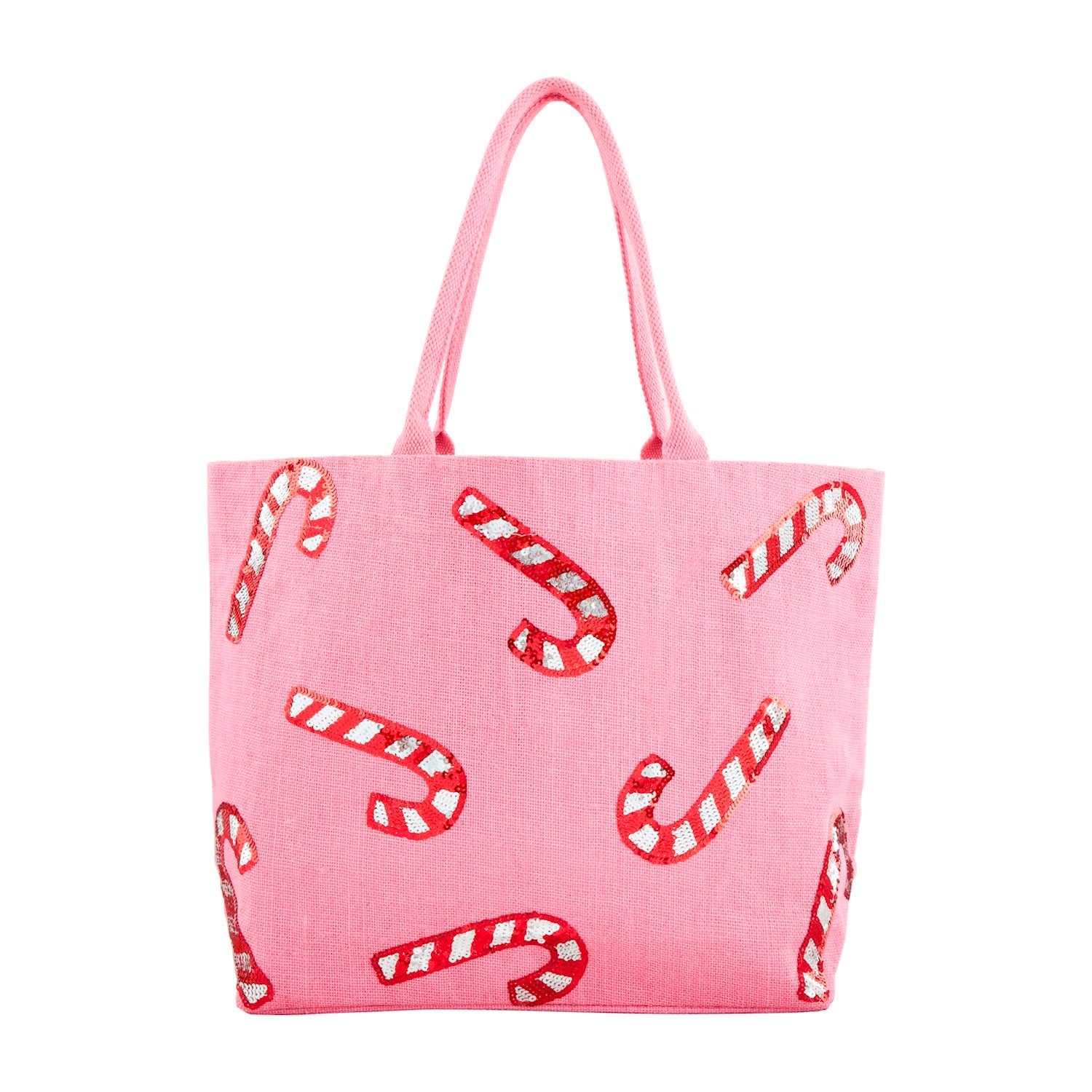 Sequin and tinsel embellished jute tote features cotton webbing handles and laminated wipe-clean interior.