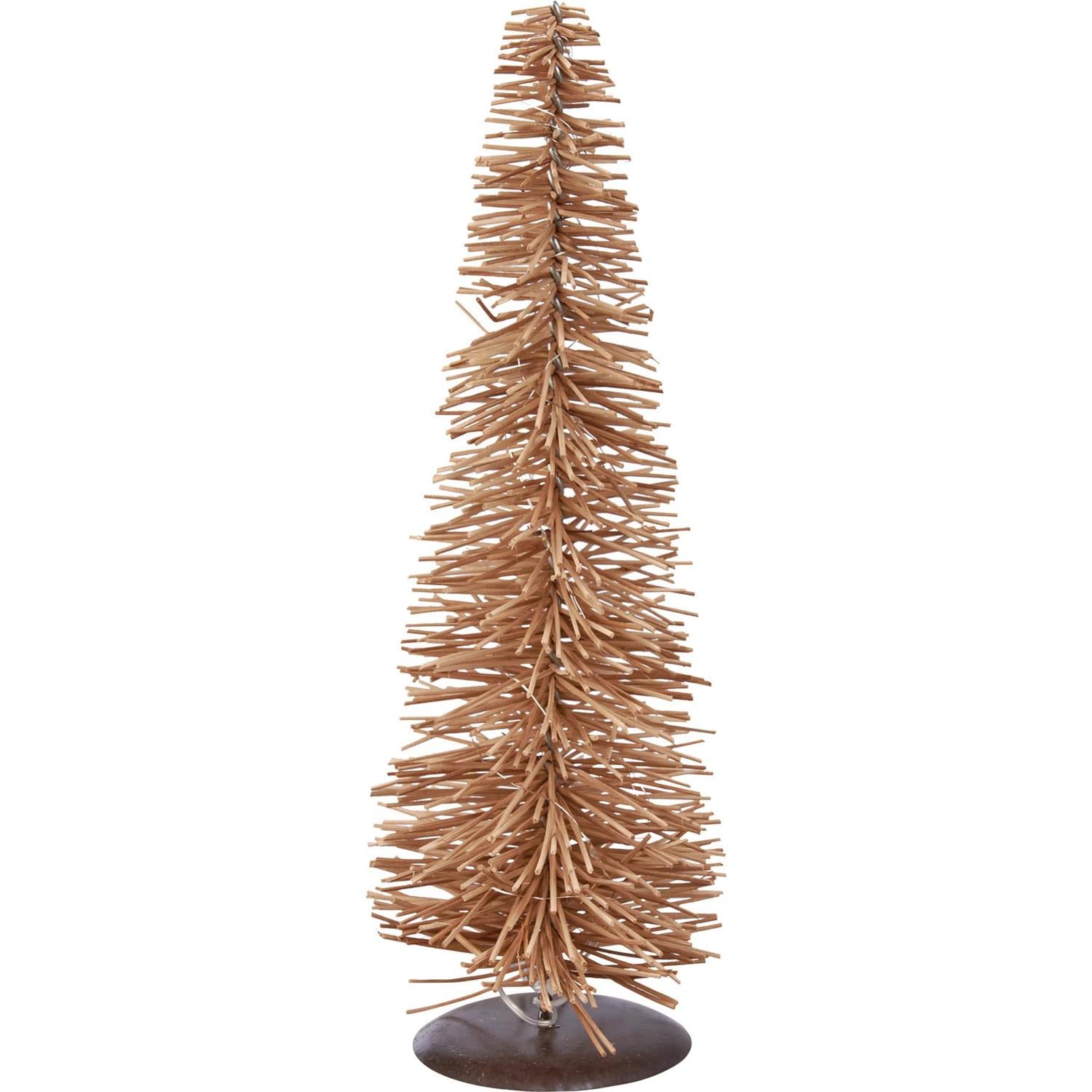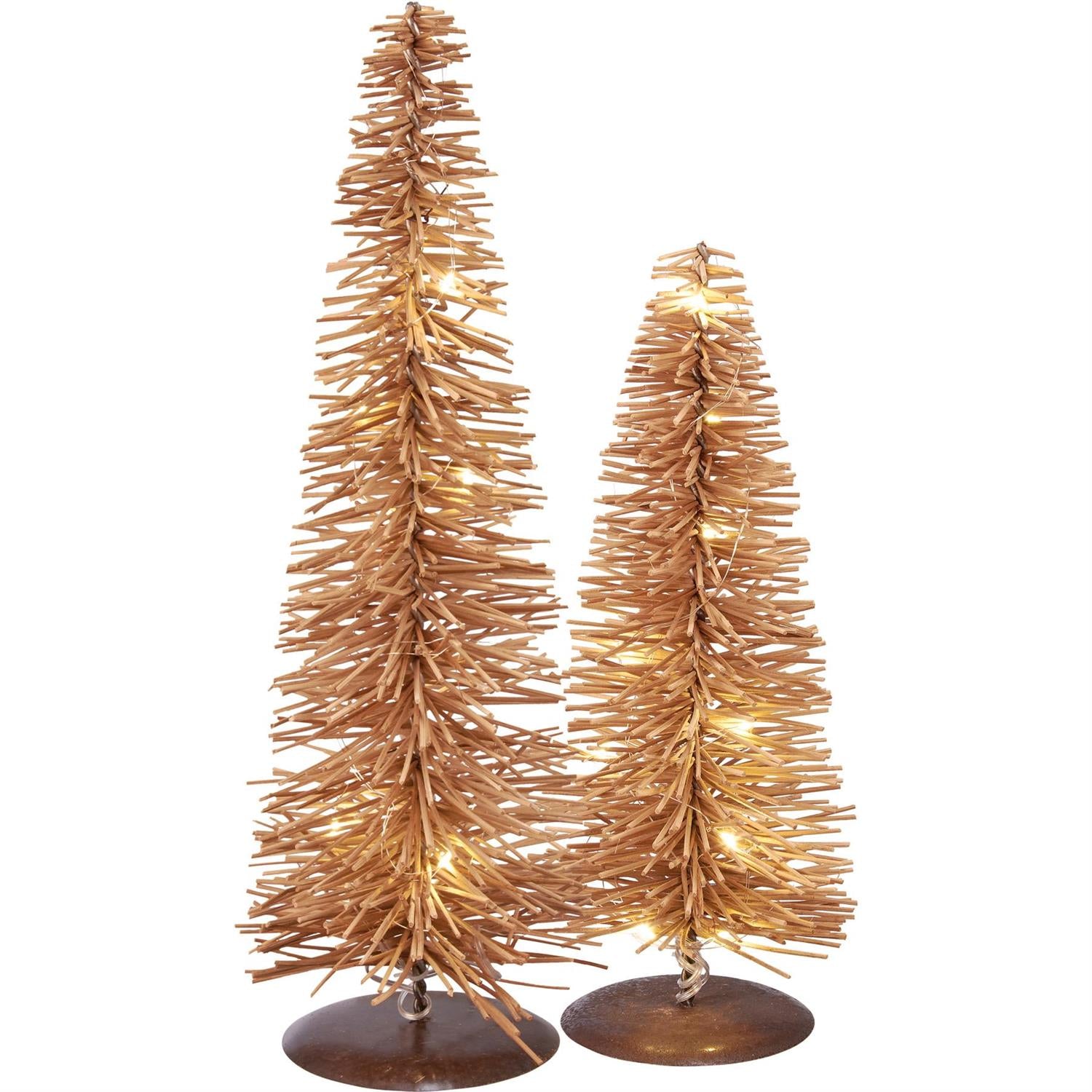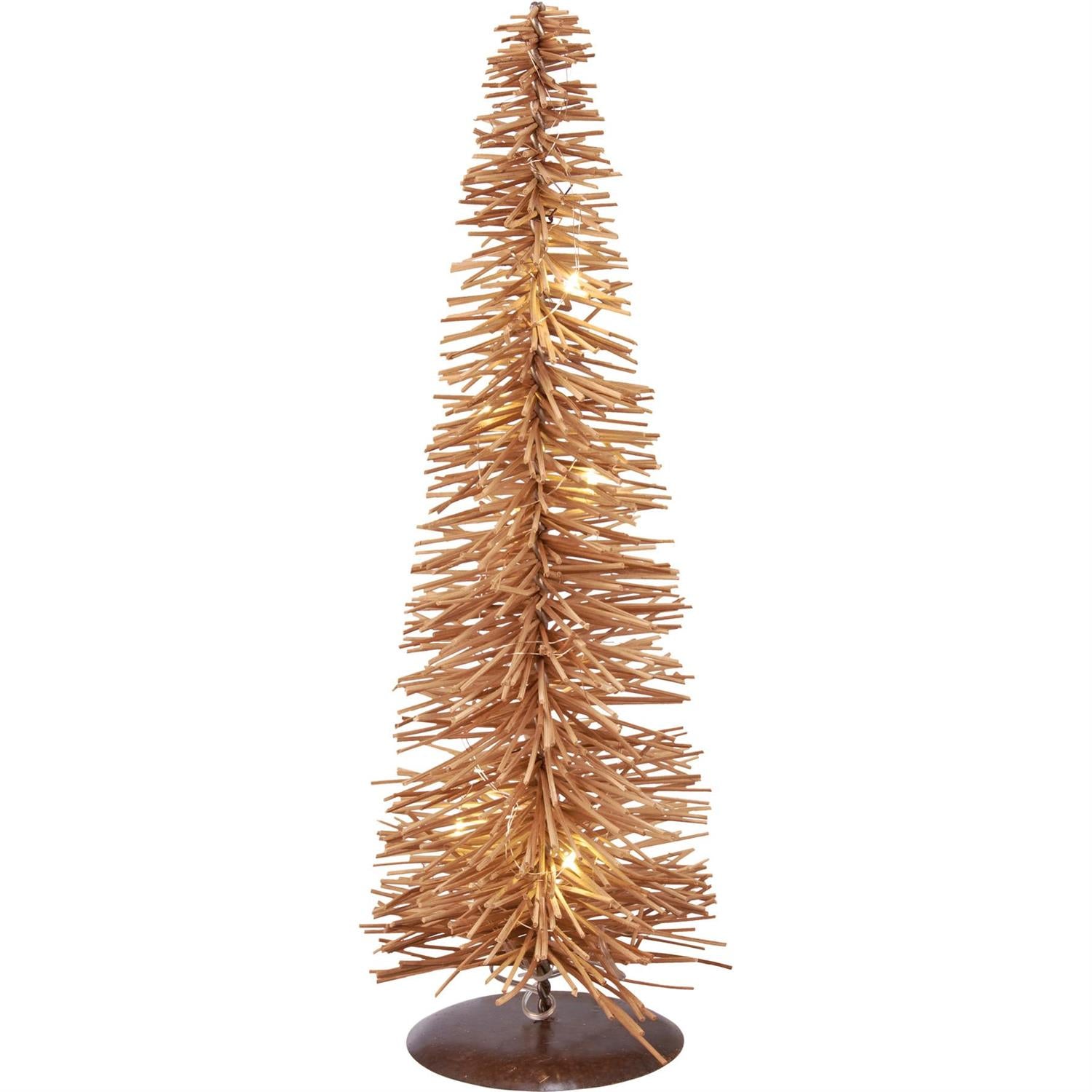 These lighted trees from our Christmas Collection display a unique bohemian design. They feature rattan style bristles and wire lights throughout for a warm holiday feel. Lights use a six hour timer and are powered by three AA batteries (not included). The lighted rattan tree free-stands alone on flat surface.