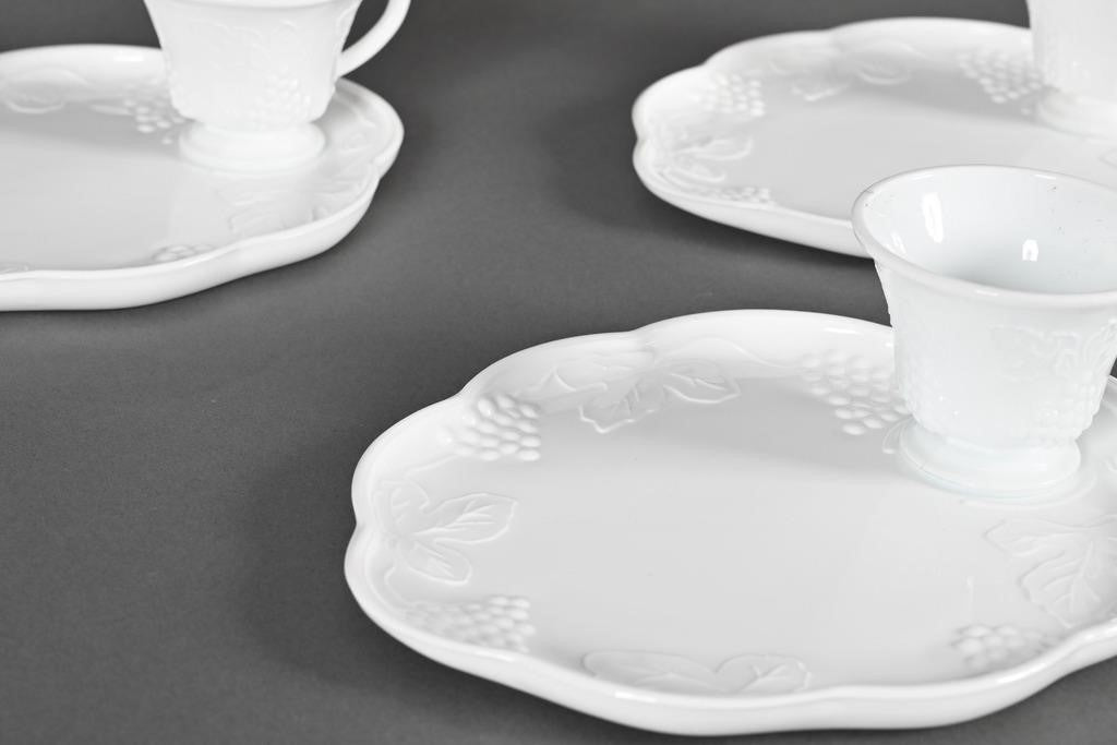 Elevate your hosting with our Milk Glass Snack Plates and Cups. These elegant plates measure 10" x 8.5" and are perfect for serving snacks and appetizers. Crafted from durable milk glass, they add a touch of sophistication to any table setting. Impress your guests with this stylish and functional set.