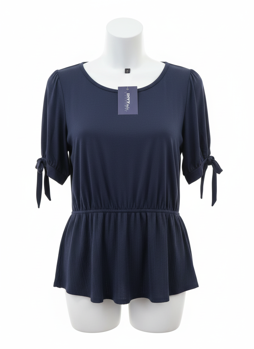 This Navy Blue Babydoll Knot Top from P.S Love is a versatile and stylish addition to your wardrobe. The top features tied up sleeves for a touch of detail and a flattering silhouette. Perfect for any occasion, this top will elevate your look and make you feel confident and chic.