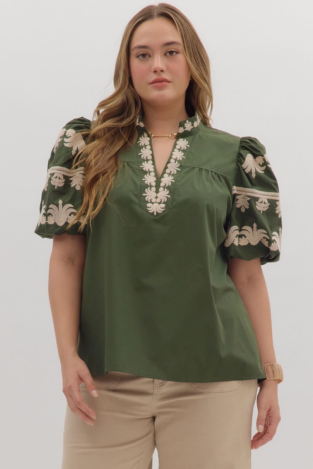 Embrace effortless style with our Olive Embroidered Top. This solid V-neck band collar pullover boasts an elegant embroidered placket, short bubble sleeves, and a lightweight, non-sheer woven fabric. Perfect for any occasion, dress it up or down.