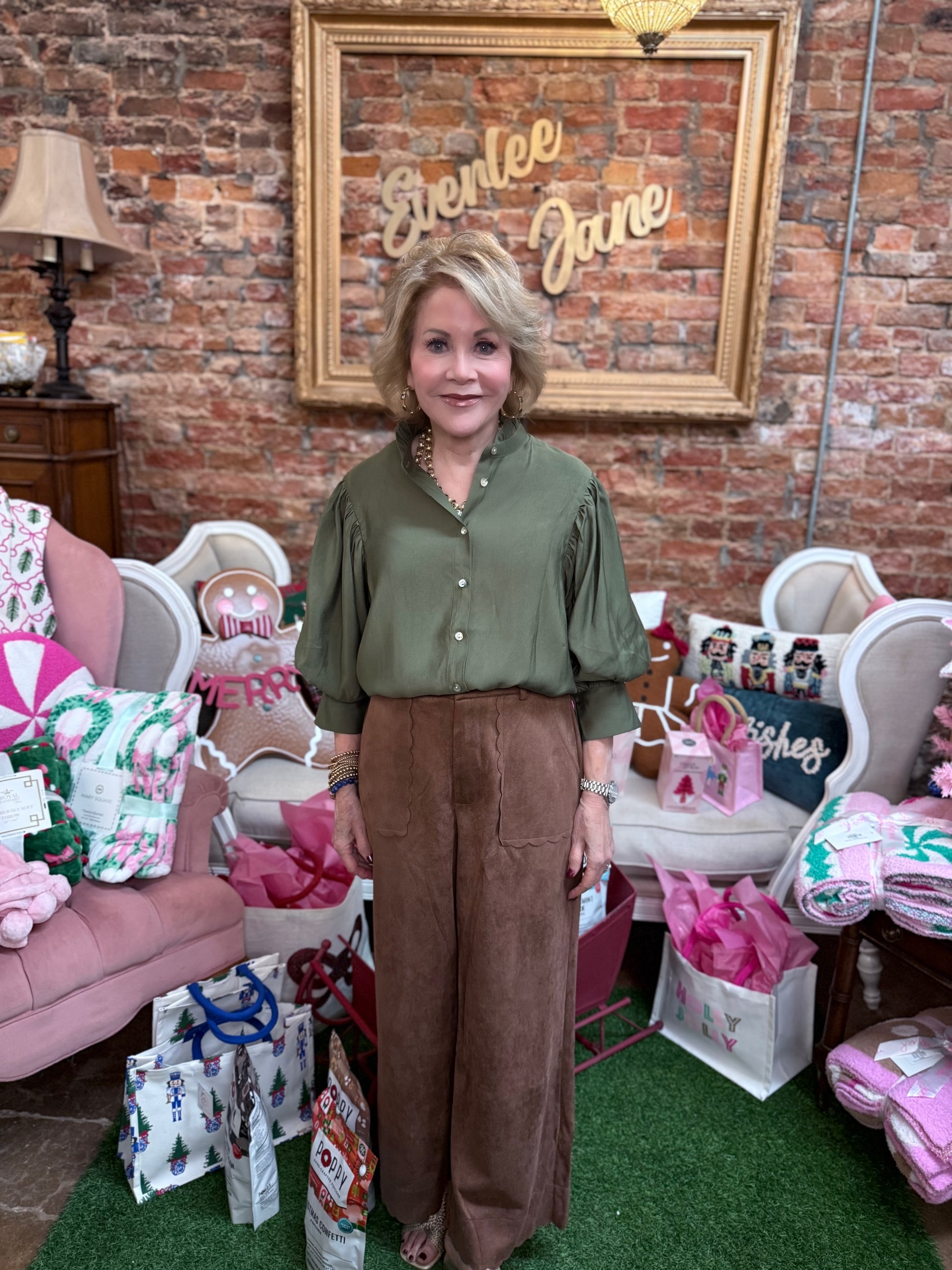 Elevate your wardrobe with this elegant Olive blouse, featuring a subtle olive color that catches the light beautifully. Designed with a stylish button-up front and delicate ruffle neck, it exudes sophistication at every turn. The puffed 3/4 sleeves end in tailored cuffs, creating a polished silhouette perfect for work, date nights, or parties. This versatile piece combines refined details with comfortable wearability, making it an expert choice for effortless style and confident presence.