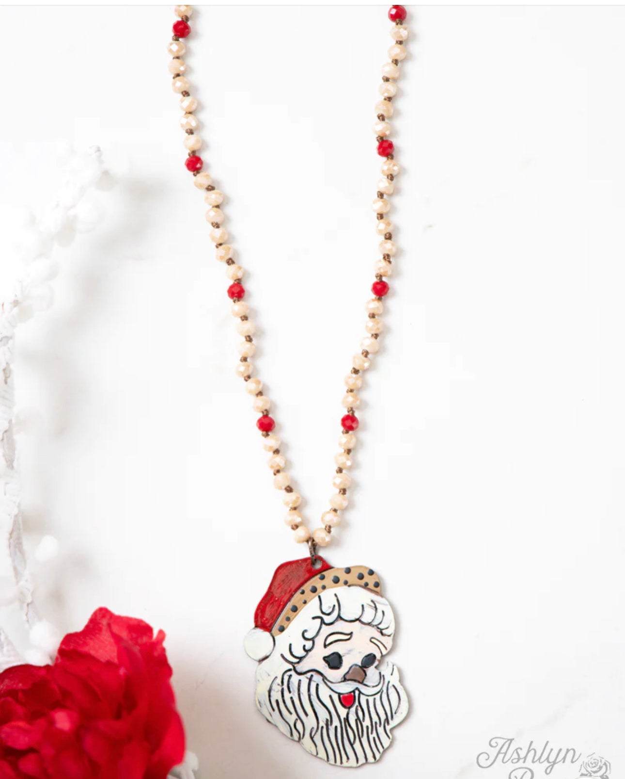 Santa Claus pendant on Beige beaded necklace with a metal pendant.