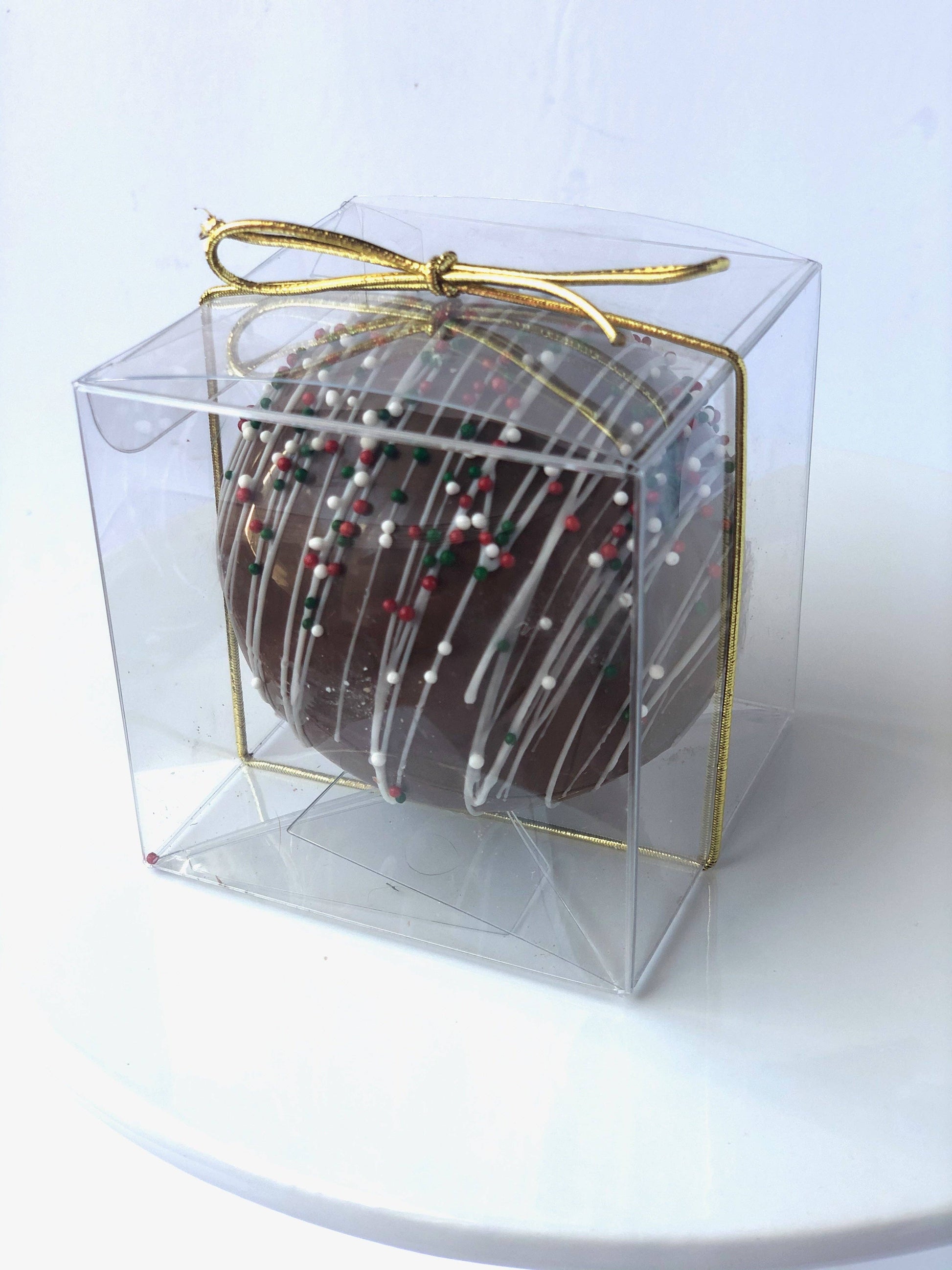 These Santa themed hot chocolate bombs are perfect to share with the family. These make an adorable fun treat for kids of all ages during the holidays. Simply add the chocolate ball to an oversized mug, pour Hot milk and watch the chocolate melt away and the marshmallows explode! Stir and enjoy a delightful cup of hot Cocoa with your family. Each item will be individually wrapped in a clear box.