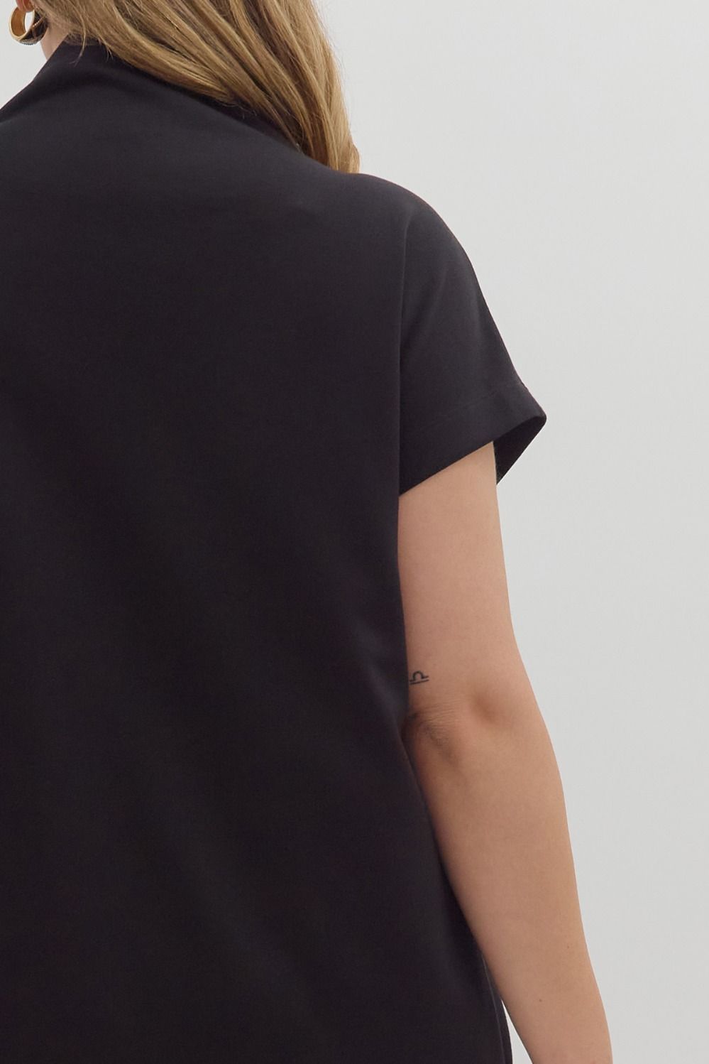 Crafted from buttery soft, lightweight knit fabric, this solid jersey mock neck pullover dress offers effortless style and comfort. Its mini length and unlined construction keep it breathable and versatile, while the side pockets add practical convenience. Designed in classic black, this non-sheer piece layers seamlessly for both casual and refined looks.