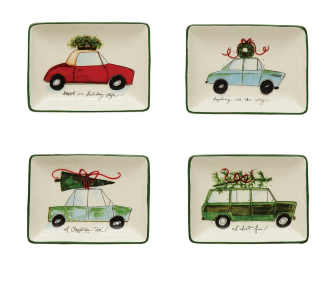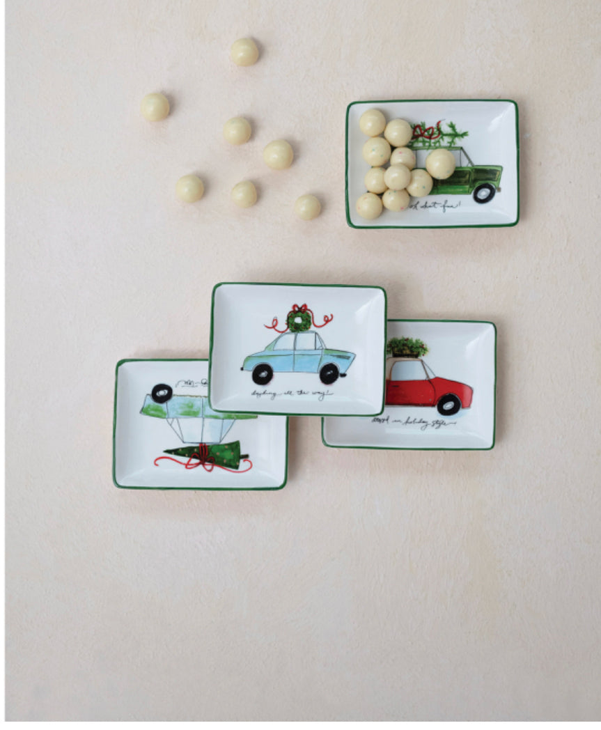 : 4"L x 3"W Stoneware Dish w/ Car & Holiday Saying, Multi Color, 4 Styles
