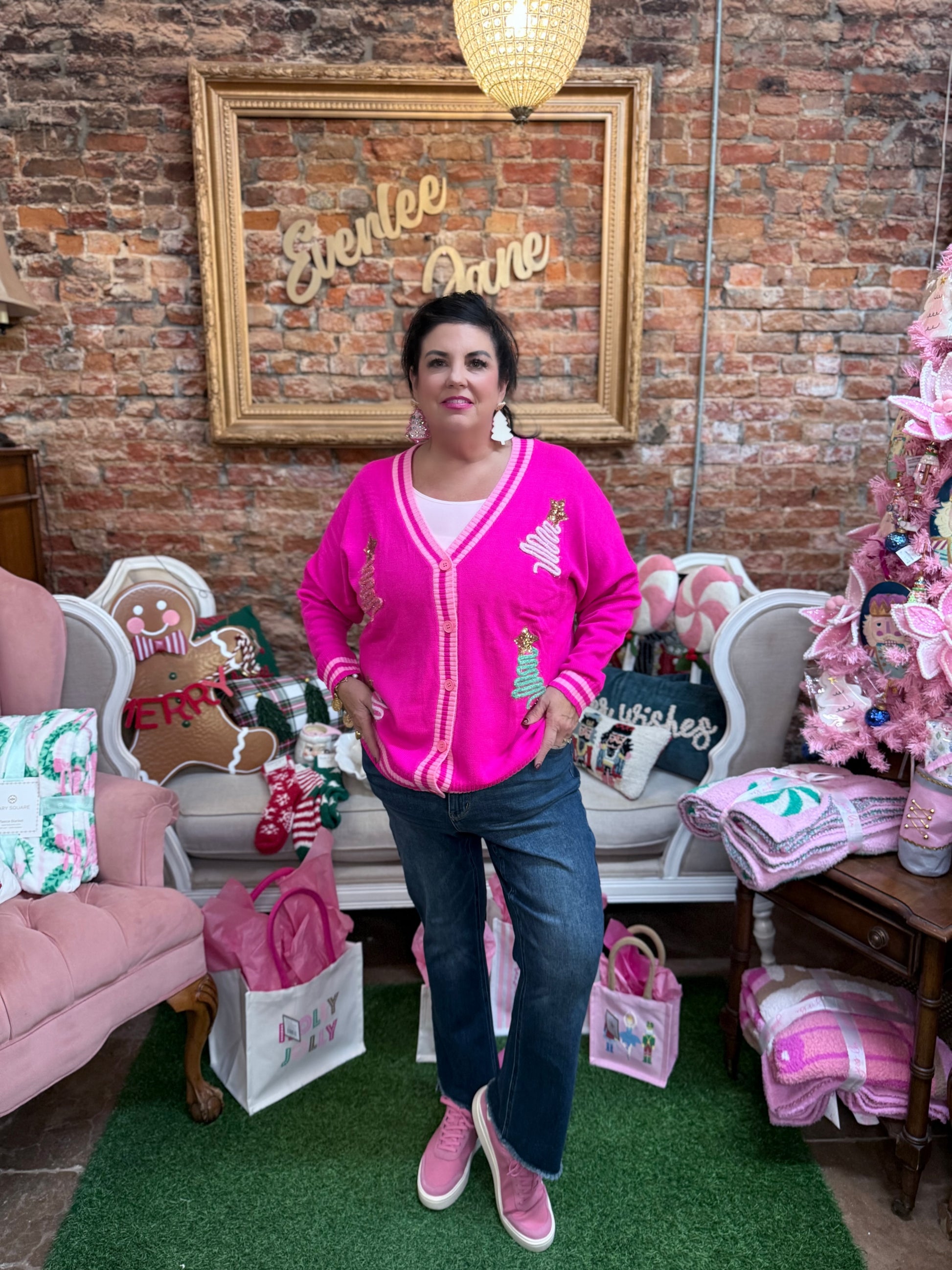 Add a vibrant touch to your holiday wardrobe with the Tinsel Trees Relaxed Cardigan. Featuring a hot pink base with light pink highlights and colorful tinsel trees topped with sparkling star toppers, this cardigan brings a playful and festive vibe perfect for celebrating the Christmas season!