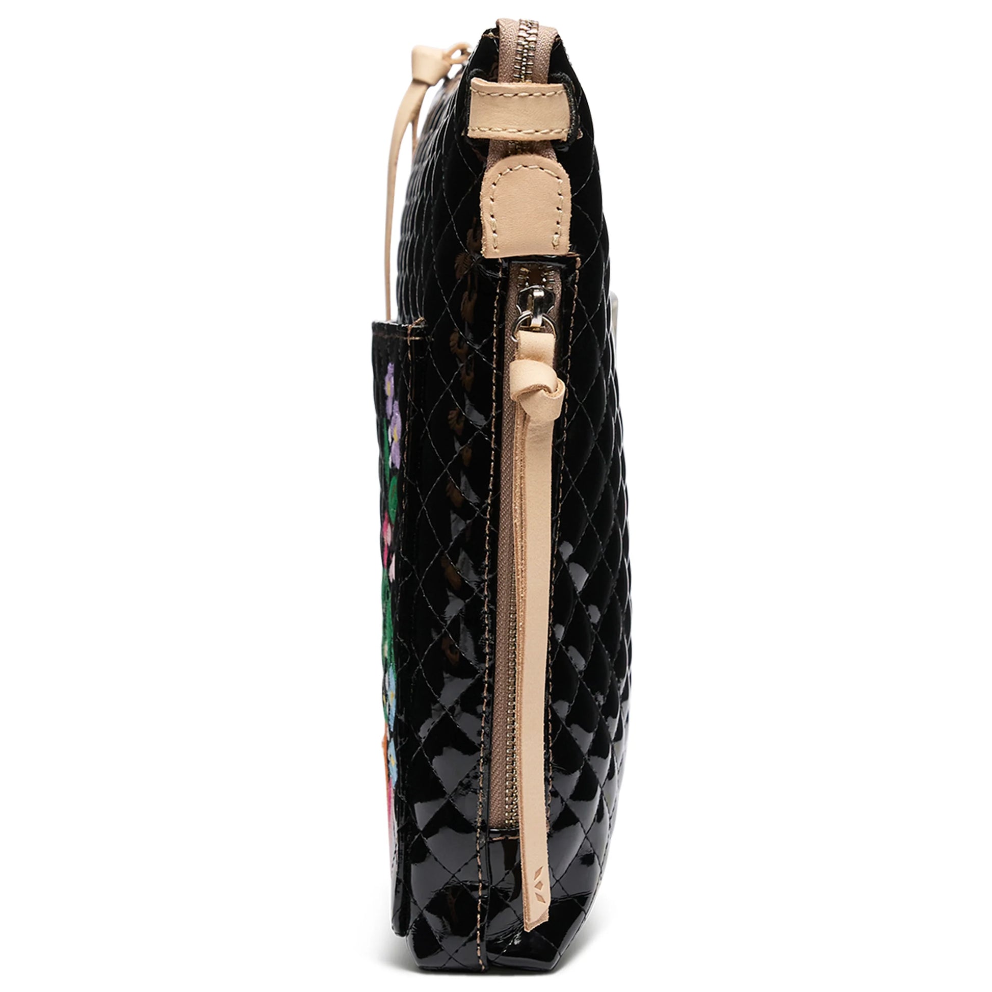- Iconic floral embroidery on black quilted exterior