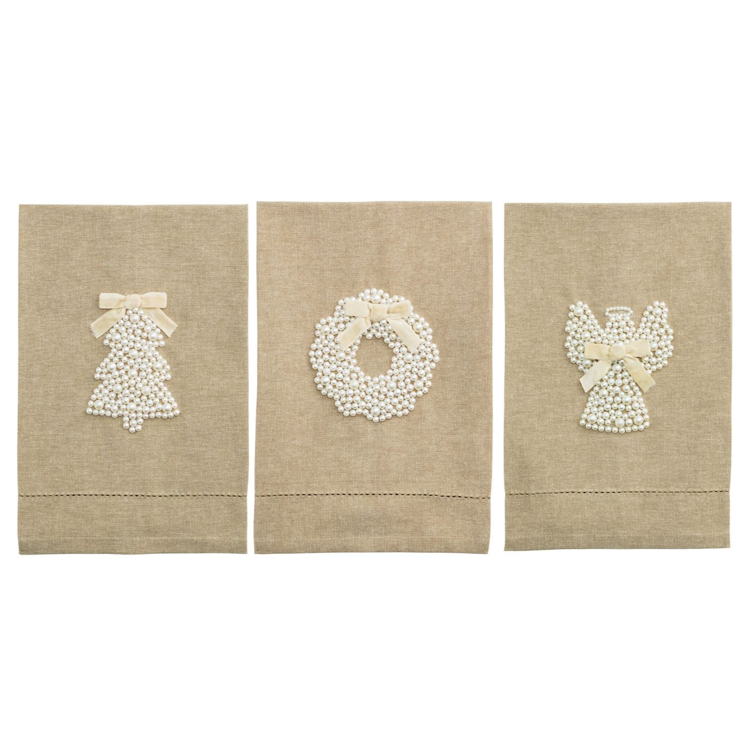 Chambray hand towel features pearl bead appliqué with velvet bow and hem stitching.
